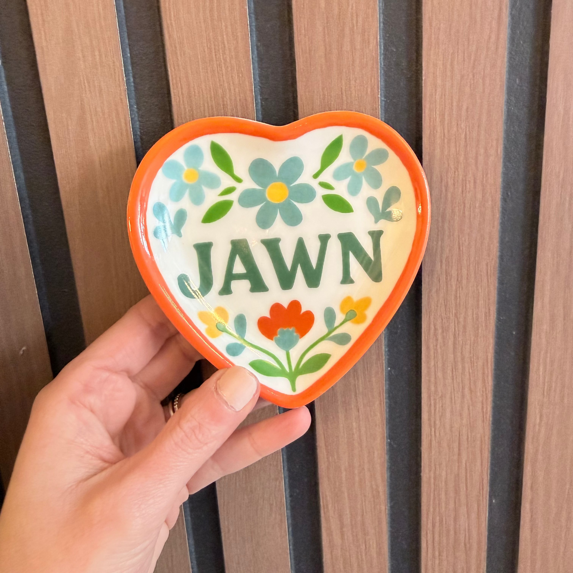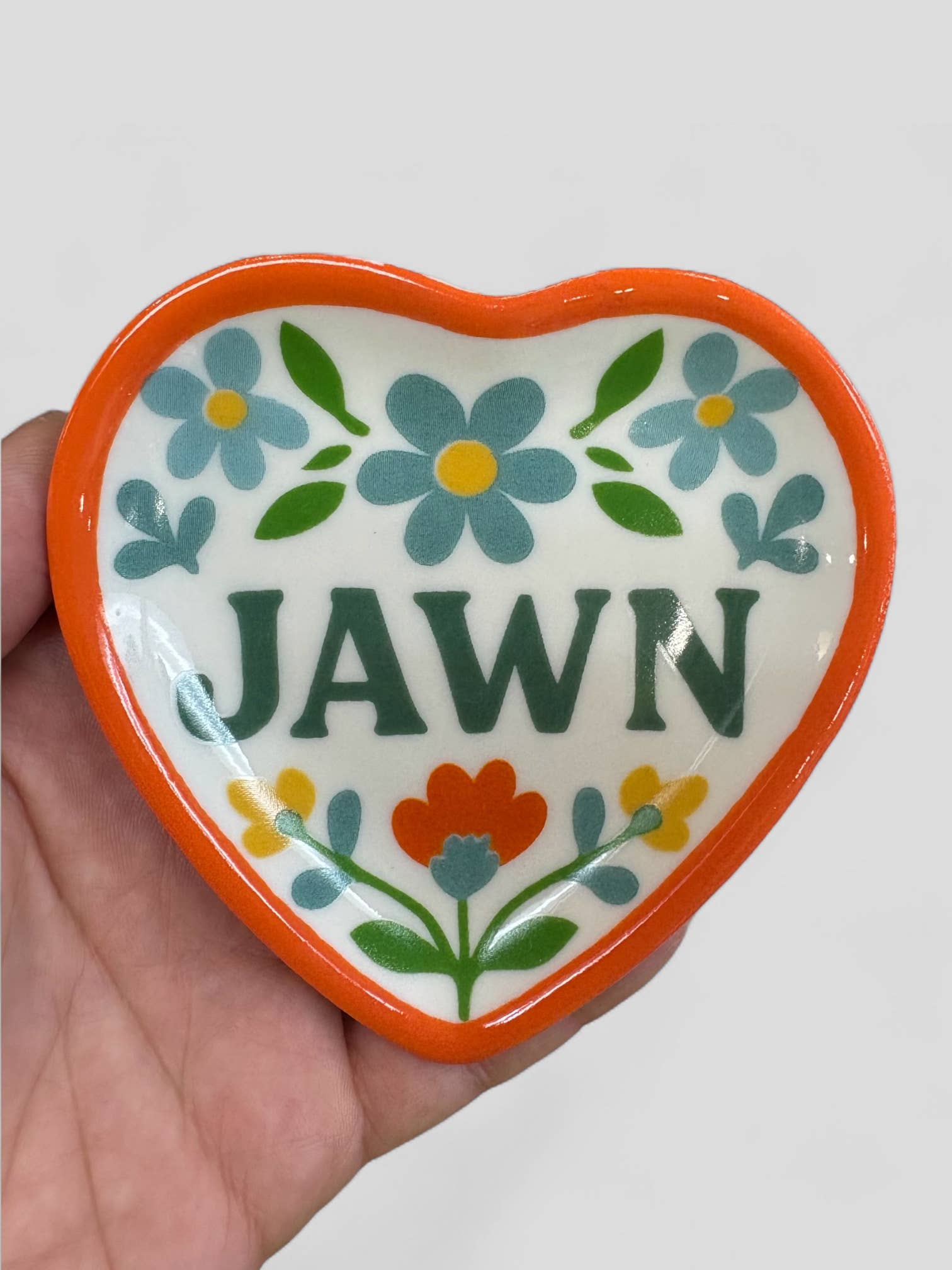The Jawn Heart Shaped Ceramic Trinket Tray is the sweetest catch-all for your everyday essentials — rings, earrings, keys, hair ties, and all the tiny things that never stay where you put them. Featuring a heart shape and everyone’s favorite Philly word, it’s equal parts functional and full of personality.